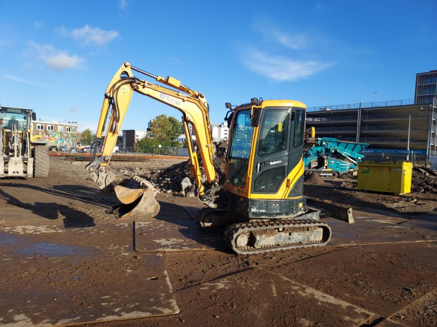De Hyundai R30Z-9AK is een 3,4 ton zware minigraafmachine met zero tail swing (binnendraaier).